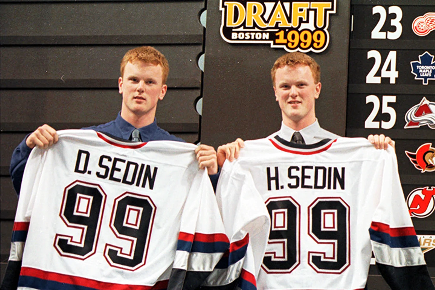 Менеджер «Ванкувера» Брайан Бурк хотел обменять свой пик первого раунда драфта, потому что не видел на горизонте достойных юниоров. Шведский скаут «Кэнакс» настоятельно рекомендовал присмотреться к двум братьям Сединам. Бурку они не приглянулись, поскольку провалили встречу с Канадой на МЧМ, набрав много очков на групповой стадии против слабых сборных. Менеджер передумал, когда увидел 18-летних братьев на взрослом чемпионате мира. Показанная шведскими близнецами игра на этом уровне мгновенно убедила в необходимости их драфта. Вот только выбор у команды в раунде был один (3-й), а игроков двое и играть они хотели вместе.