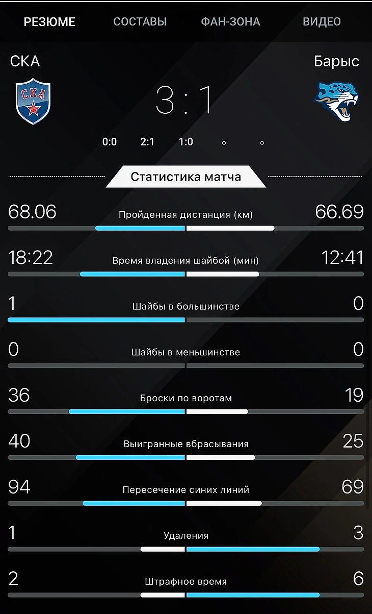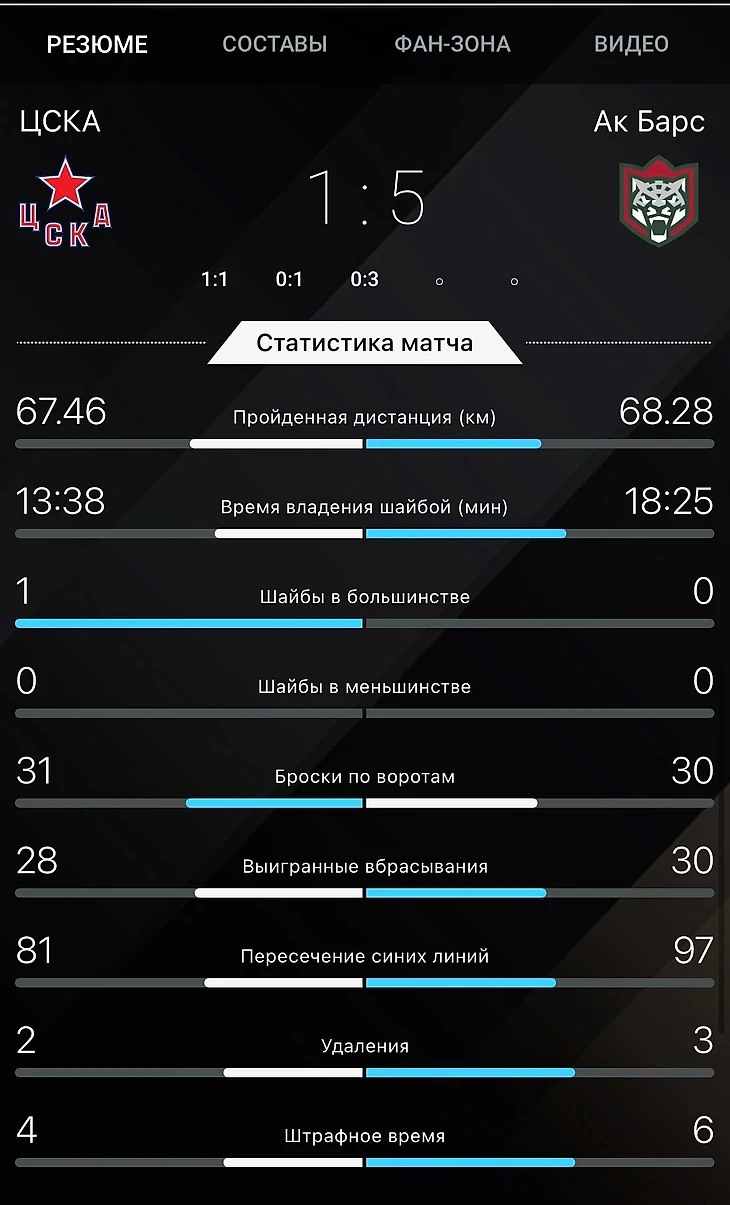 Первый период прошёл в целом при равной игре и если бы не ошибка голкипера «ЦСКА», который пропустил шайбу с острого угла, то он завершился бы 1-0. Но дальше же полное преимущество казанцев и им повезло, что во втором периоде в их ворота залетела всего шайба, но музыка играла недолго - всё залетело в третьем периоде.