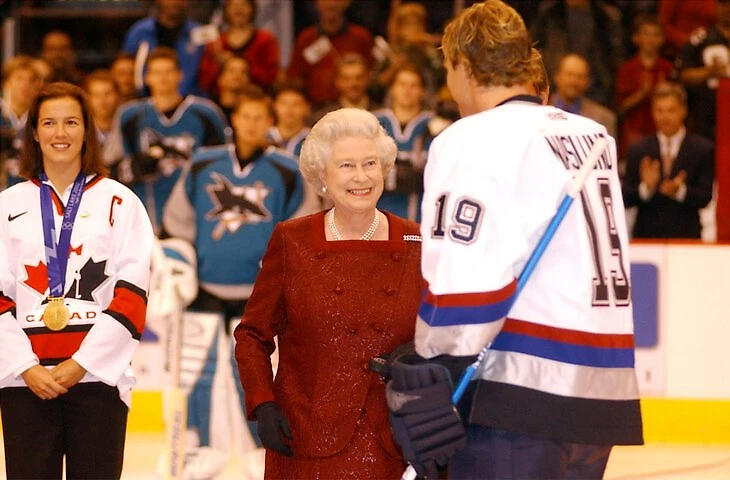Так, Елизавета оставалась молчаливым хоккейным зрителем до 2002 года, пока во время юбилейного турне, посвященного 50-летию ее восшествия на престол, в компании Уэйна Гретцки не провела символическое вбрасывание на матче между «Ванкувером» и «Сан-Хосе».
