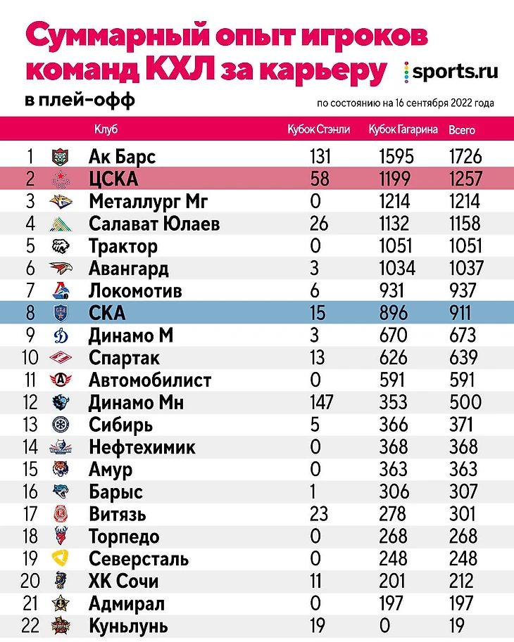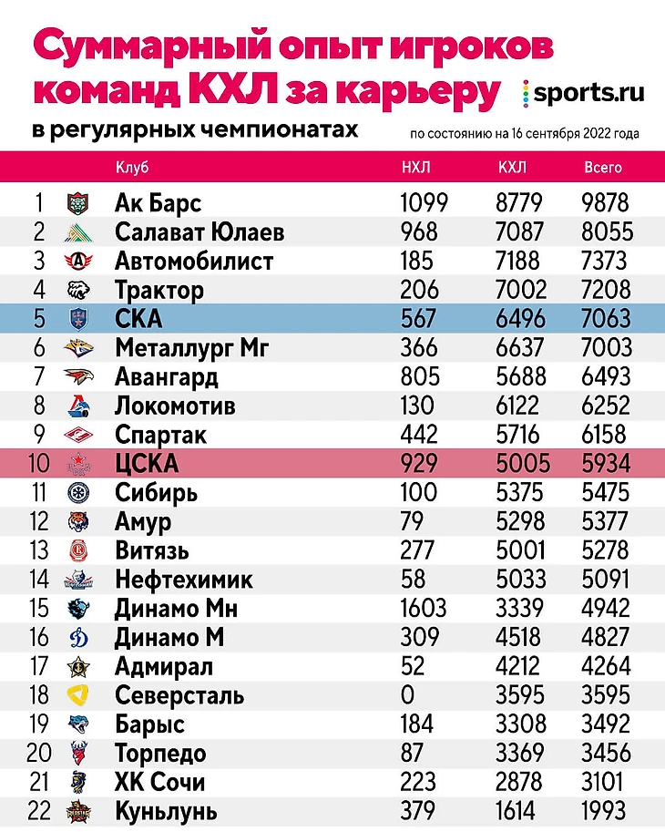 С уходом возрастных игроков, ряда легионеров и введением в состав молодых парней у армейских клубов просел суммарный опыт. Мы подсчитали, сколько игроки всех команд лиги провели матчей в регулярках КХЛ и НХЛ и отдельно – в розыгрышах Кубка Гагарина и Кубка Стэнли. Так вот по опыту в регулярных чемпионатах цифры удивляют: СКА только пятый, а ЦСКА – аж на десятой строчке.
