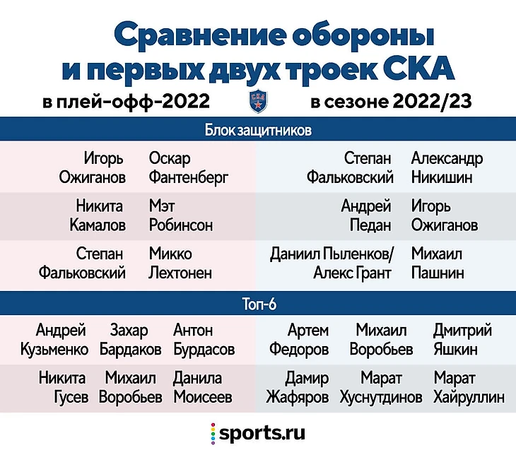 Питер этими трансферами пересобрал две первые тройки, укрепил оборону опытными игроками и усилил нижние звенья крепким чекером. Плюс стоит упомянуть прогресс Александра Волкова (25 лет) и Валентина Зыкова (27), которые обычно выходят в третьем звене, но в первых матчах чемпионата набирают в среднем очко за игру и получают больше игрового времени, чем раньше. А вообще просто сравните, каким блок обороны и топ-6 СКА в матчах плей-офф-2022 с нынешним.
