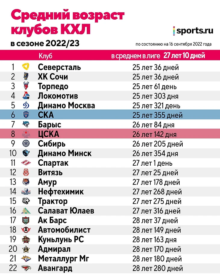 Мы запросили в КХЛ данные о среднем возрасте команд – и внезапно выяснилось, что СКА занимает шестое место, а ЦСКА – восьмое. Получается, что моложе армейских команд только «Северсталь», «Сочи», «Торпедо», «Локомотив» и московское «Динамо». Плюс «Барыс» опережает ЦСКА.