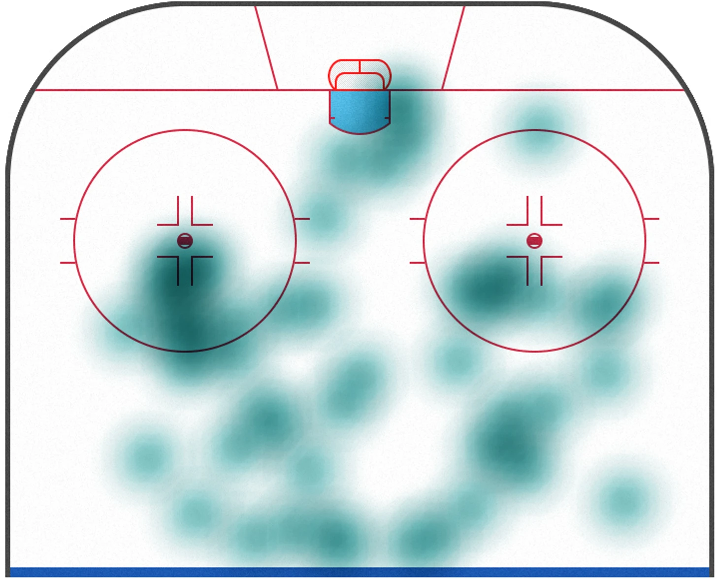 Так выглядит карта бросков казанцев в большинстве. Большое пятно в левом круге вбрасывания, чуть поменьше в правом. Приличное количество дальних бросков и совсем немного активности у ворот. В бросках из круга нет проблем, если они наносятся после резких поперечных передач, тогда при перемещении вратаря шансы забросить повышаются. После короткого паса от синей нужен исключительный по силе и точности бросок, чтобы забить.
