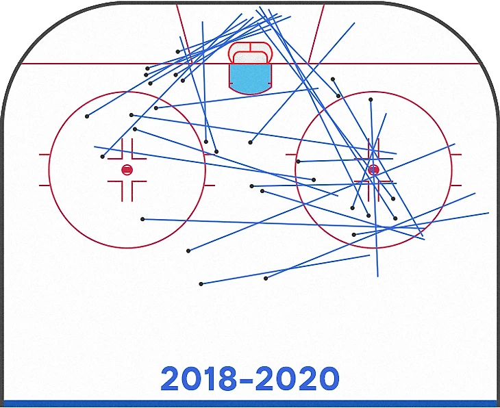 На синей линии под большинство по сути есть только Войнов. Он много бросает, но делает это с крайне маленькой эффективностью. Даже в ситуации 5-на-3, когда можно спокойно устроить розыгрыш у ворот, он чуть сблизившись бросает мимо, выпуская шайбу из зоны. Отдельно стоит отметить нахождение Шипачева на пятаке в 2 случаях из 3, он пытался закрывать вратаря – это к вопросу о правильном использовании игрока.