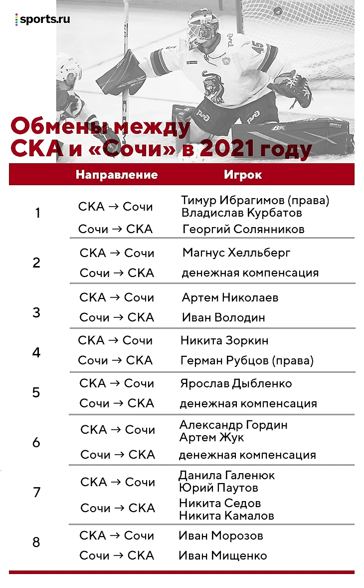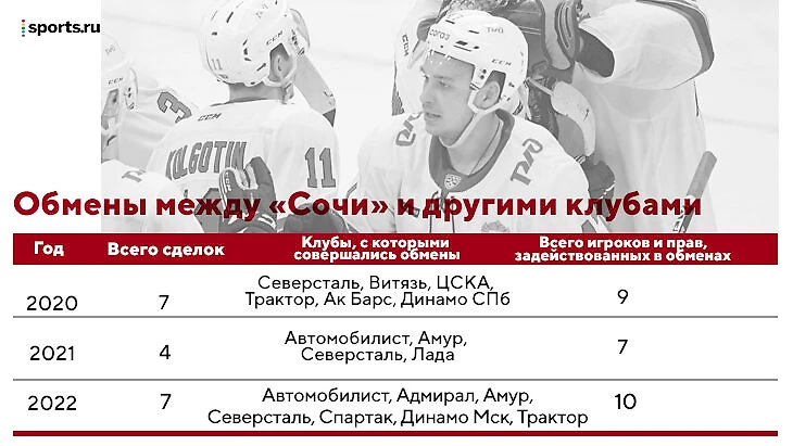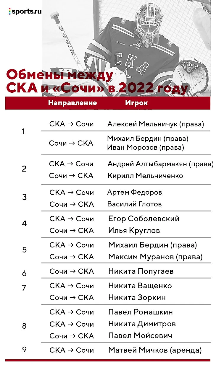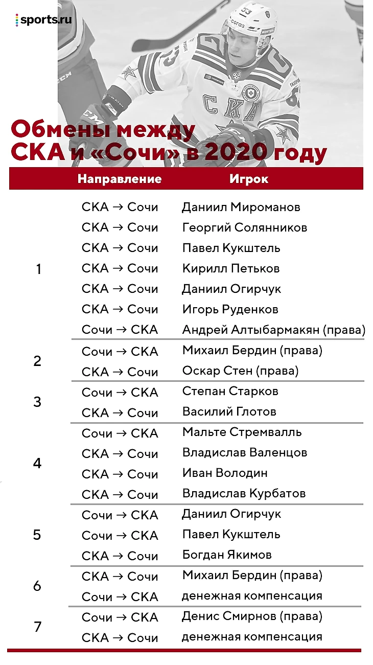 7 из 18 обменов СКА и «Сочи» приходятся на 2020 год. В этих сделках оба клуба задействовали 17 игроков или спортивные права на них, а некоторые и вовсе съездили туда-обратно.
