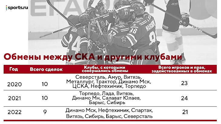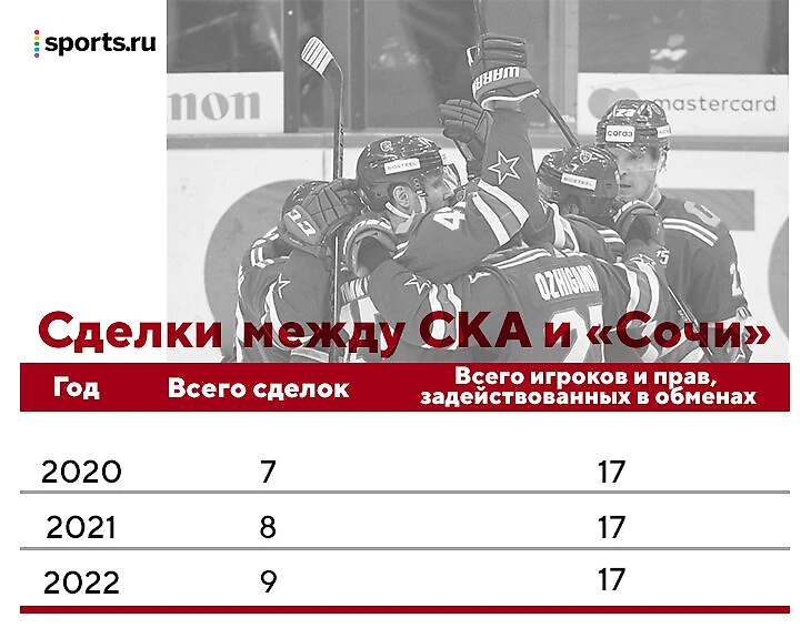 В любом случае картина получается интересной. В 2020 году у СКА было 7 обменов с «Сочи» и 10 – с другими клубами. И даже сравнение по игрокам будет уместным: с южанами задействованы 17 игроков или прав на них, с остальными клубами КХЛ – 23 игрока. Похожая картина была и в 2021-м.