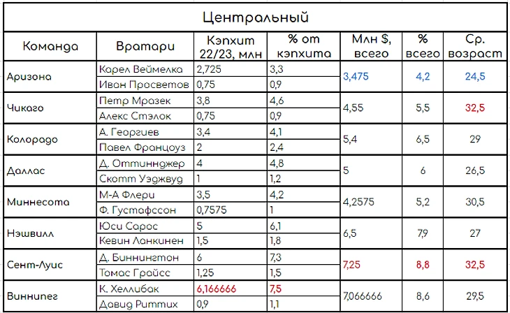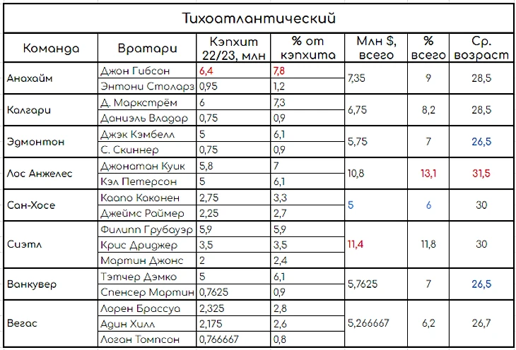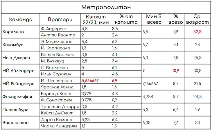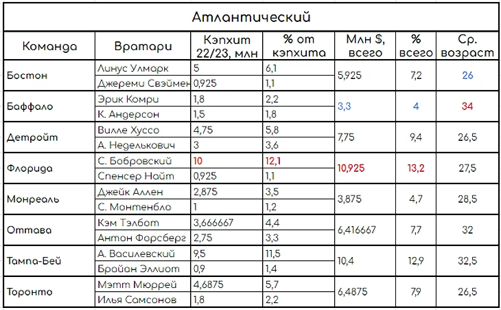 Все вратари Тихоокеанского дивизиона стоят 58.1 млн $, Центрального - 43,5 млн, Метрополитан - 52,1 млн, Атлантического - 55.1 млн.