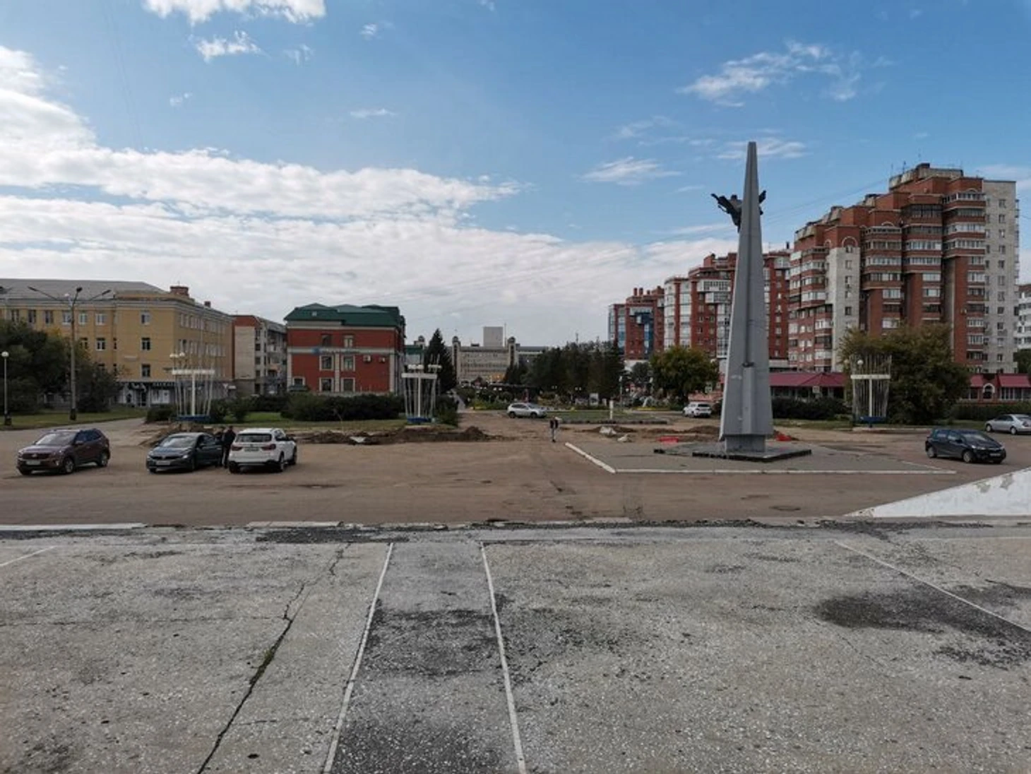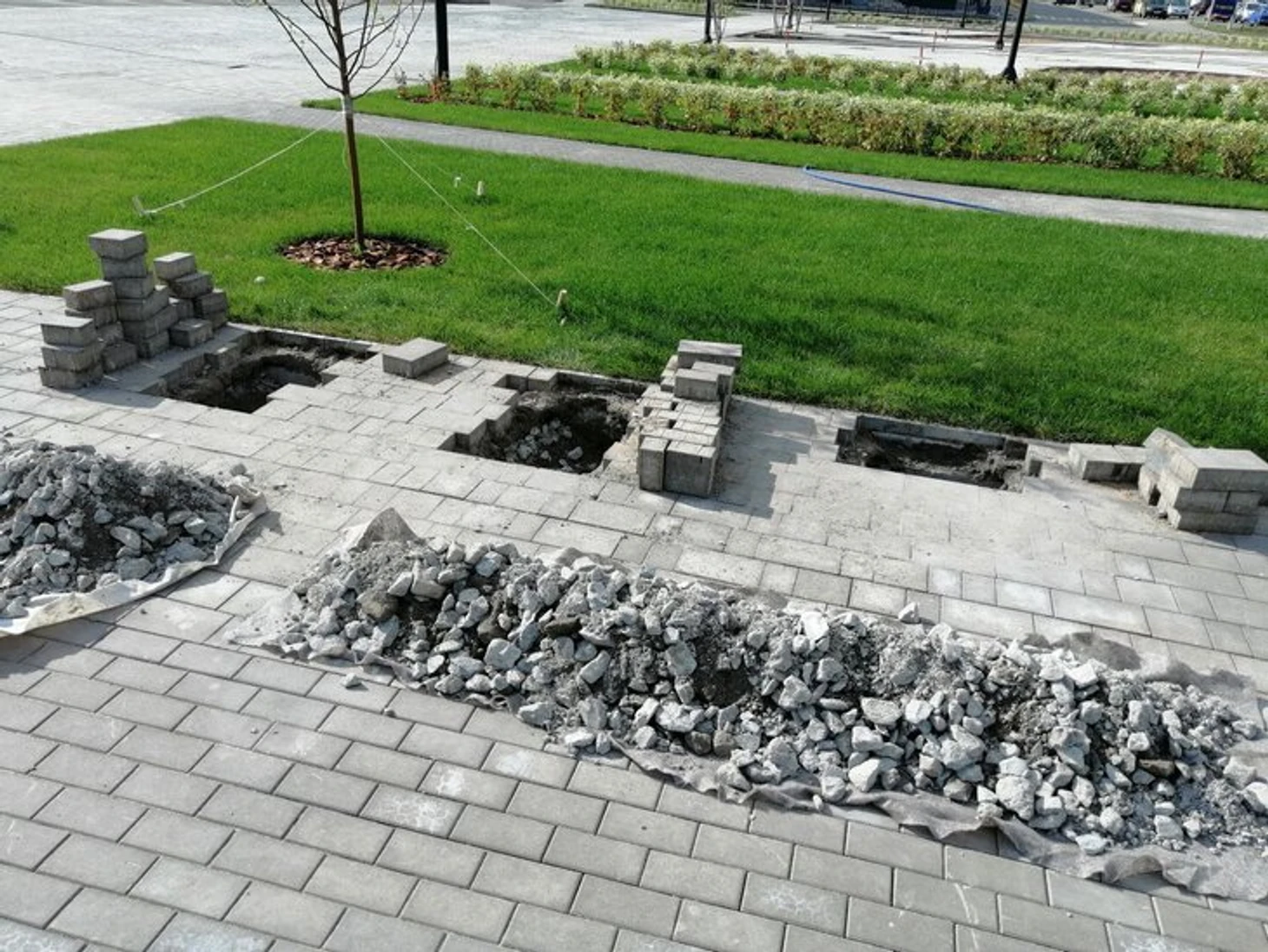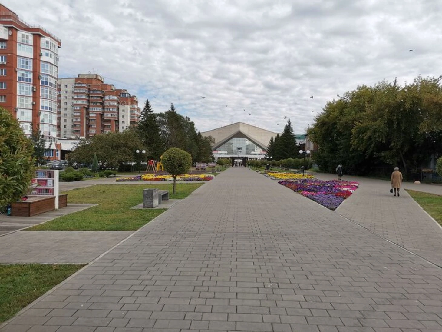 Плитку укладывали уже в сентябре, как и стелили газоны. Погода в Омске была солнечная.