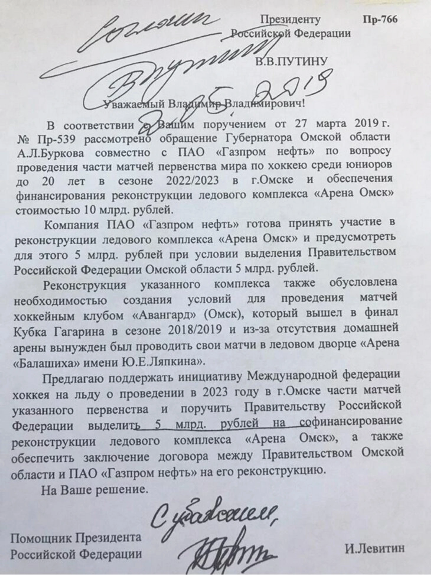 Как «Газпром нефть» и региональное правительство убедили федеральные власти, что Омску нужно передать матчи МЧМ-2023, который к тому времени уже был забронирован за Новосибирском, доподлинно неизвестно. Зато известен документ, где советник президента РФ Игорь Левитин просит выделить на омскую стройку 5 млрд рублей, мотивируя предложение еще и тем, что одному из ведущих клубов КХЛ – «Авангарду» – негде играть.