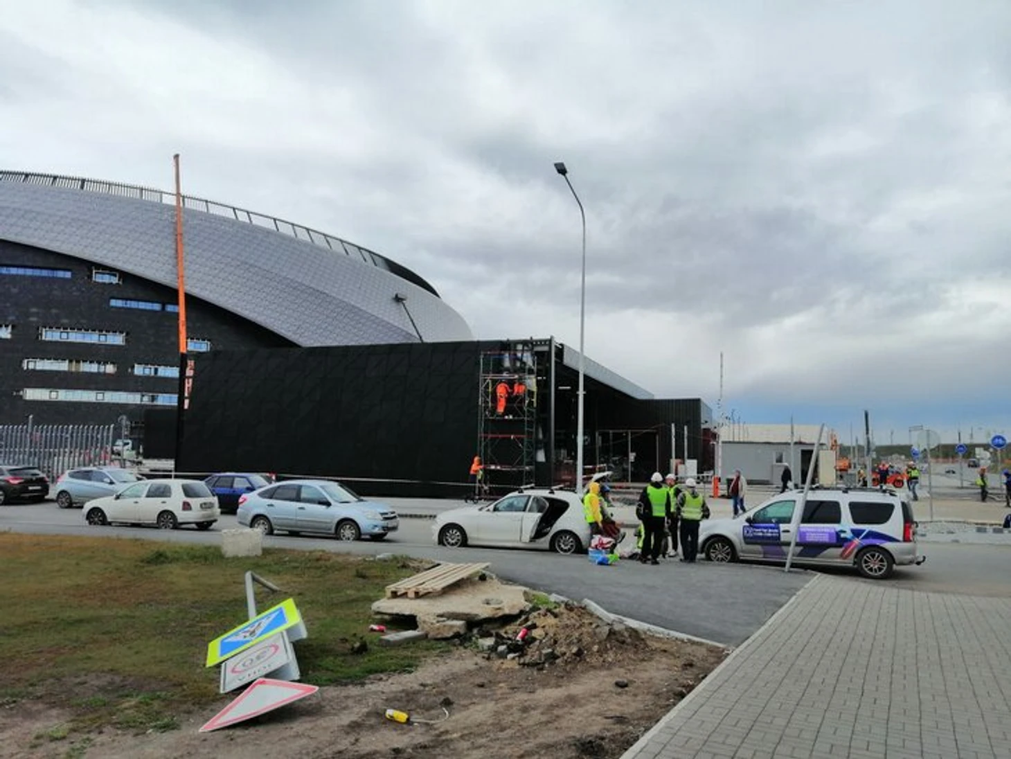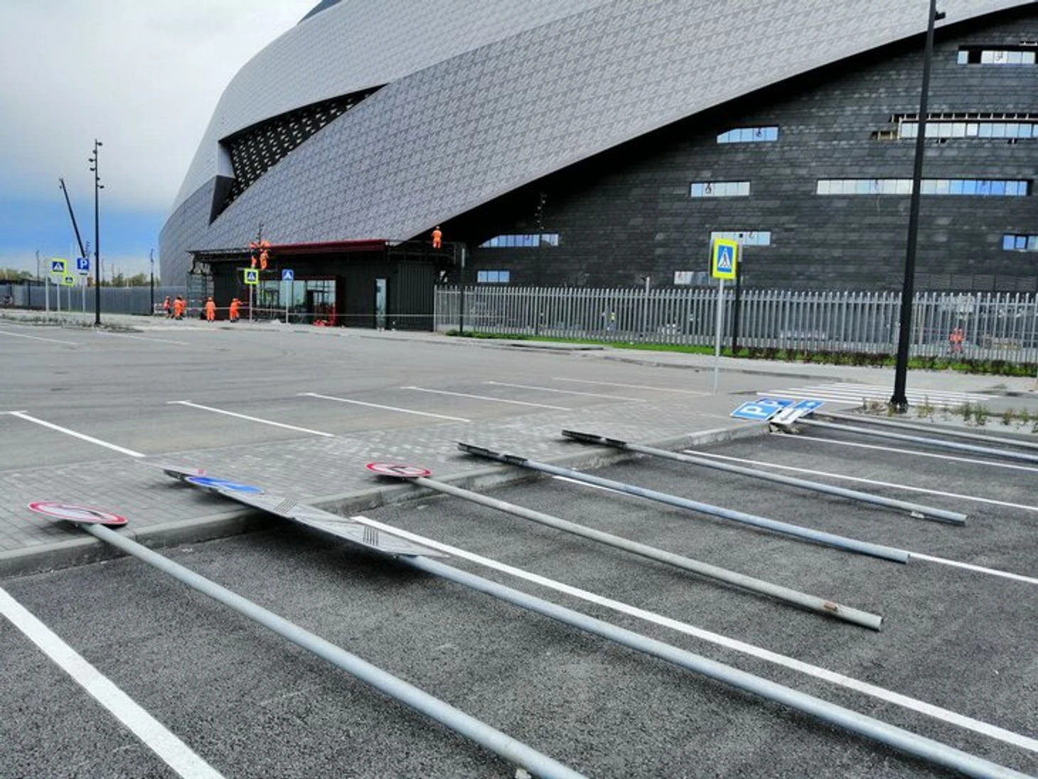 Мы застали самое жаркое время: даже дорожные знаки еще не были установлены на парковке около арены.