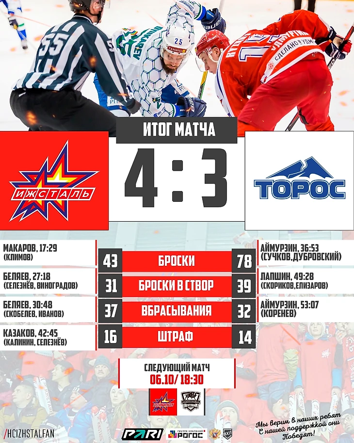 Несмотря на все плюсы и минусы сегодняшней игры, "Ижсталь" одержала вторую победу подряд в домашней серии. Следующую игру команда проведёт 6 октября против "Нефтяника". Матч обещает быть жарким!