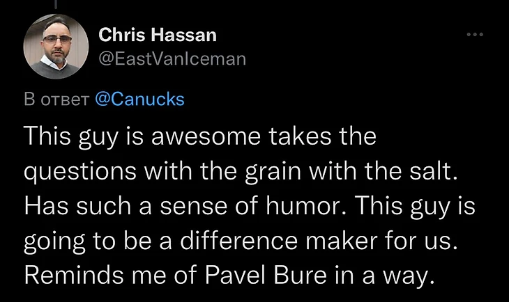 «Этот парень шикарно отвечает на вопросы, у него особое чувство юмора. Кажется, он может стать для нас тем, кто сделает разницу. Напоминает мне Павла Буре»