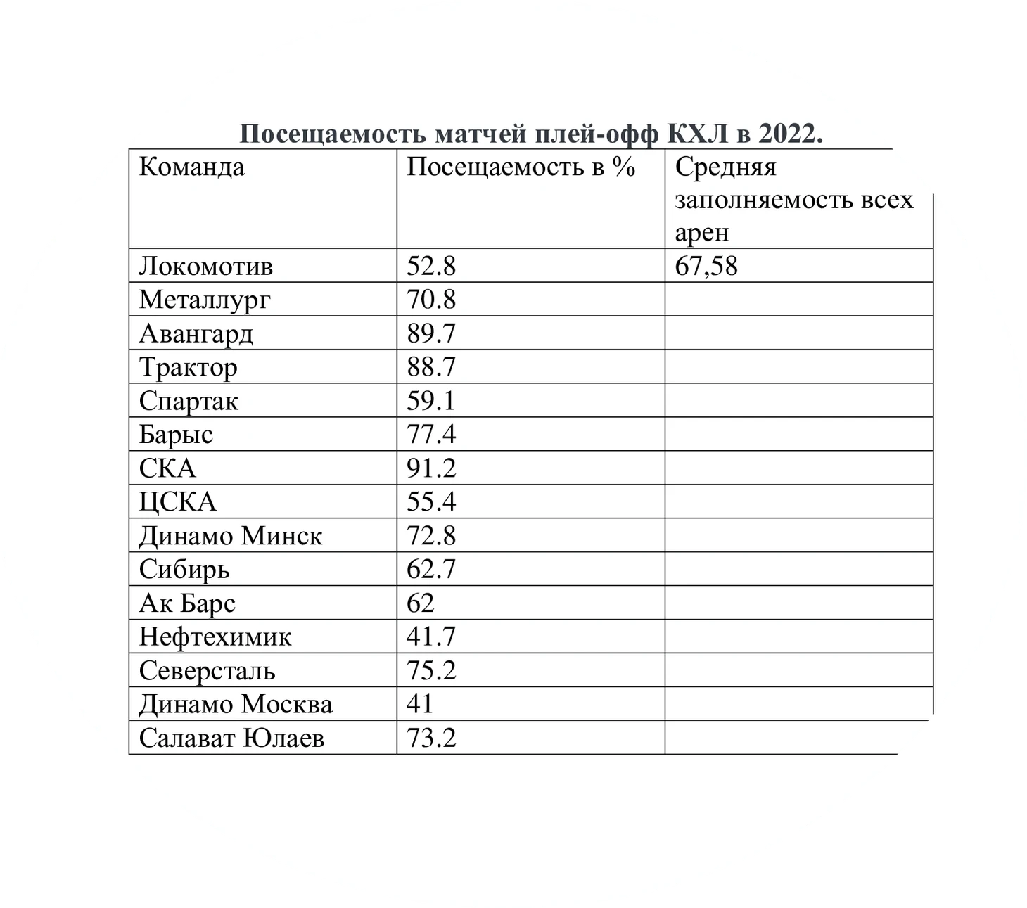 Как мы видим, в 2015 году средняя заполняемость всех арена была очень даже на уровне: более 93%. Теперь сравним это с 2022 годом: