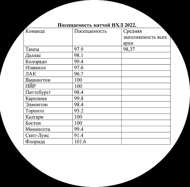 Тут средняя заполняемость составляет чуть более 67%. Да, на 1-2 аренах еще были коронавирусные ограничения, но, согласитесь, разница в более чем 25% просто необъяснима. Вот так хоккей теряет зрителей: КХЛ просто становится никому не нужна. Ну и просто так для дополнения прикреплю таблицу по посещаемости матчей плей-офф НХЛ 2022. Тут средняя заполняемость арен более 98%, думаю, комментарии излишни: