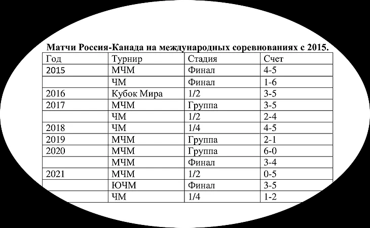 Тут корень этой причиной сравним с корнем предыдущей: о матчах Россия-Канада знают все. Если мы победили Канаду, это очень круто, все - молодцы! Проиграли - все плохо, у нас нет сборной. Не зря говорят, что успешным турниром сборной России считается тот турнир, где мы либо выиграли золото, либо обыграли Канаду в плей-офф. Ну такой уж менталитет у всех нас, мы так привыкли, нашим болельщикам нужны победы. Тут прикрепляем таблицу всех матчей с Канадой на крупных турнирах с 2015: