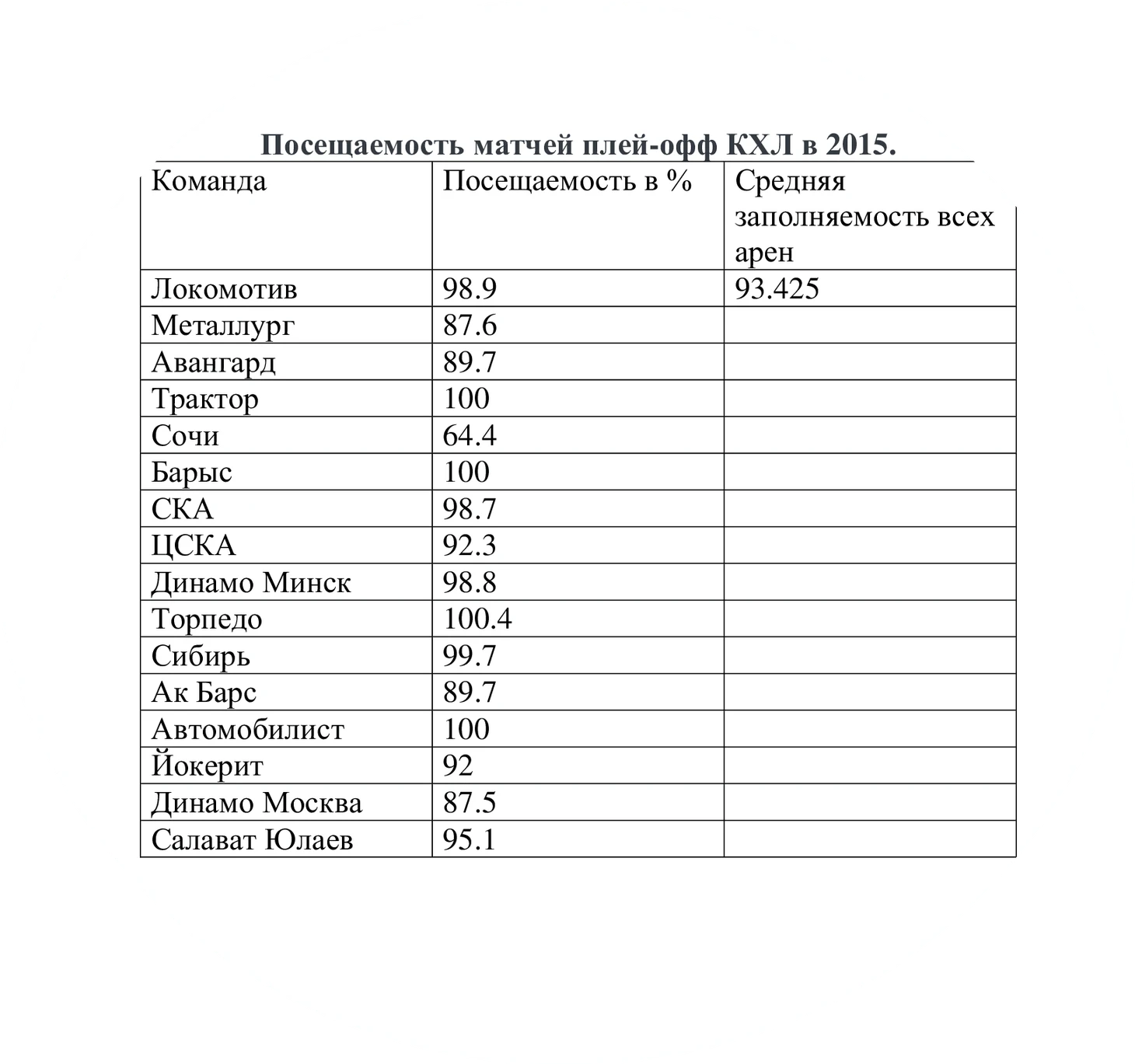 Посещаемость матчей КХЛ становится все более интересной темой: все мы знаем, что один из главных матчей сезона 22-23 ЦСКА-СКА посетило 4 тысячи человек (при вместимости больше 12 тысяч). Для наглядности еще раз обратимся к таблицам: сначала про посещаемость матчей плей-офф КХЛ в 2015: