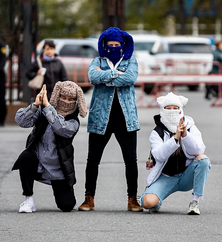 А это самый нестандартный приезд хоккеисток. Мария Микаэльян, Мария Сорокина и Ксения Тюрина из «Агидели» решили скрыть лицо.