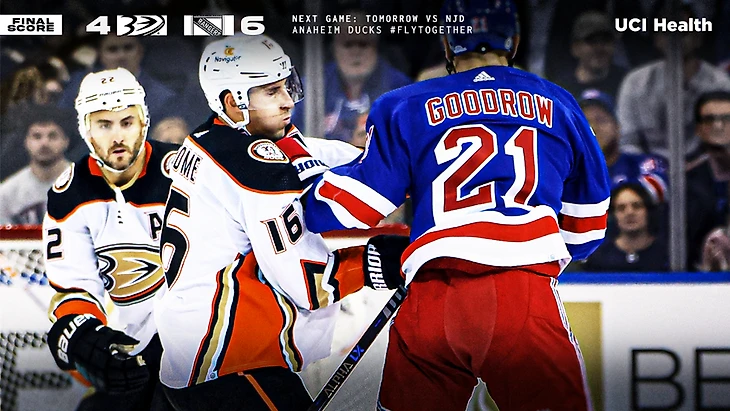 "Нью-Йорк Рейнджерс"-"Анахайм Дакс" 6:4.Артемий Панарин набрал 4 очка (1+3),Мика Зибанежад также набрал 4 очка (2+2),Адам Фокс отдал 3 результативные передачи,Винсент Точек набрал 2 очка (1+1),Игорь Шестёркин отразил 18 бросков.У гостей Трой Терри и Павол Регенда отдали по 2 результативные передачи,Дмитрий Куликов отдал результативную передачу.