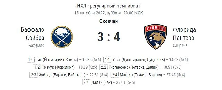 На 11-й минуте первого периода счёт открыл нападающий хозяев Алекс Так с передач Хенри Йокихарью и вратаря Эрика Комри. На 15-й минуте первого периода счёт сравнял форвард "пантер" Колин Уайт с передач Ээту Луостаринена и Антона Лунделля. Спустя четыре минуты гостей вывел вперёд Мэттью Ткачук с передачи Густава Форслинга. Через 42 секунды вновь восстановил равенство в счёте нападающий "Баффало" Земгус Гиргенсонс с передач Джон-Джейсона Петерки и Расмуса Далина.