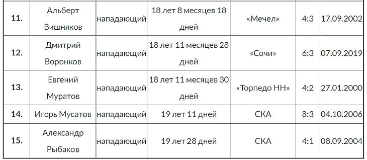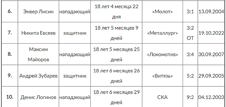 Никита Евсеев со своей шайбой расположился на 7-м месте, а Дмитрий Воронков идёт 12-м. Стоит отметить, что в топ-10 авторов самых «молодых» шайб Евсеев лишь третий защитник. Он опередил Андрея Зубарева, который поразил ворота «Витязя» 29 сентября 2005 года в возрасте 18 лет 6 месяцев 26 дней, но уступил Артёму Анисимову (18 лет 2 месяца 22 дня).