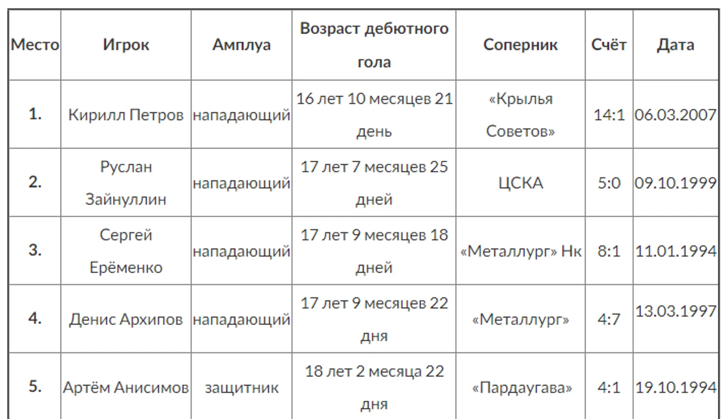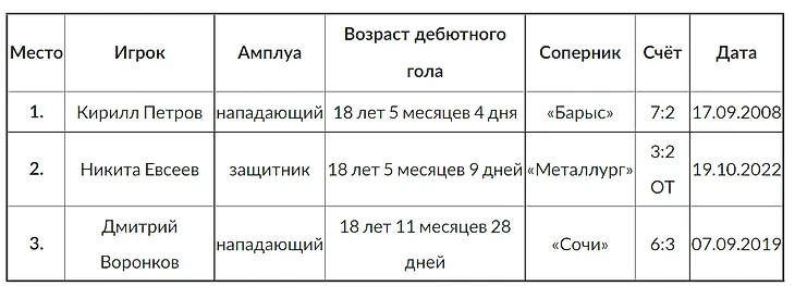 Первое место бессменно удерживает Кирилл Петров, который отличился на отметке 18 лет 5 месяцев 4 дня в ворота «Барыса», произошло это 17 сентября 2008 года. Ниже представлена тройка самых «молодых» голов казанцев в КХЛ.
