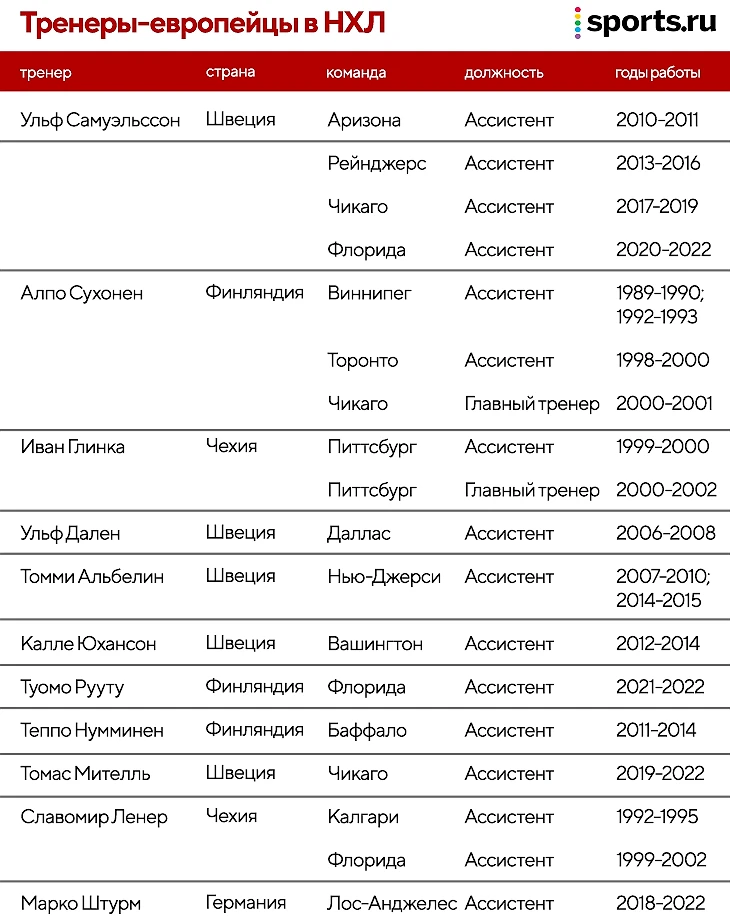 Главными в НХЛ работали только двое европейцев. Иван Глинка тренировал «Питтсбург» чуть больше одного сезона в нулевые, а Алпо Сухонен, назначенный в «Чикаго» буквально месяцем раньше, продержался еще меньше – его уволили за 7 матчей до конца своего единственного чемпионата. И несмотря на то, что Глинка сходу вывел «пингвинов» в финал конференции, оба примера считаются неудачными (чеха уволили после четырех матчей второго сезона). Видимо, поэтому с тех пор европейских главных тренеров в НХЛ не было.