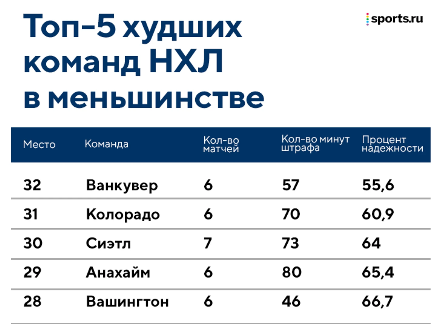 А вот что действительно очень плохо – это игра «Ванкувера» в неравных составах. «Кэнакс» пропускали в меньшинстве в пяти матчах из шести (не забил только «Коламбус»). Более того, они позволяют забить себе почти в каждом втором розыгрыше: их процент нейтрализации меньшинства (55,6) – худший в лиге. За счет этих голов соперники регулярно сокращали отставание в счете. А если прибавить то, что в первых пяти матчах у «Ванкувера» было 55 минут штрафа, то на лицо проблемы с дисциплиной в ключевые отрезки.