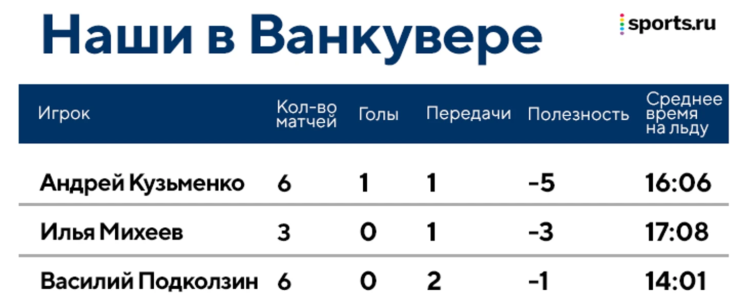 У Подколзина тоже не все гладко: две передачи в шести матчах, но он и играет меньше остальных наших. Его время колеблется от 11 до 16 минут.