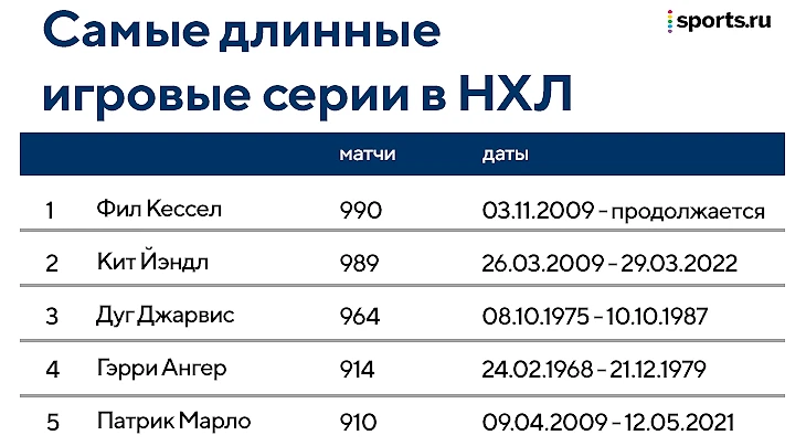 По-настоящему историческое событие произошло в Сан-Хосе, куда приехал «Вегас». В составе «рыцарей» на лед вышел американец Фил Кессел – для него этот матч стал 990-м подряд в НХЛ, который он сыграл без пропусков. Только вдумайтесь: с 3 ноября 2009 года – уже почти 13 лет – форвард появлялся на площадке в каждом матчей той команды, за которую он играл.
