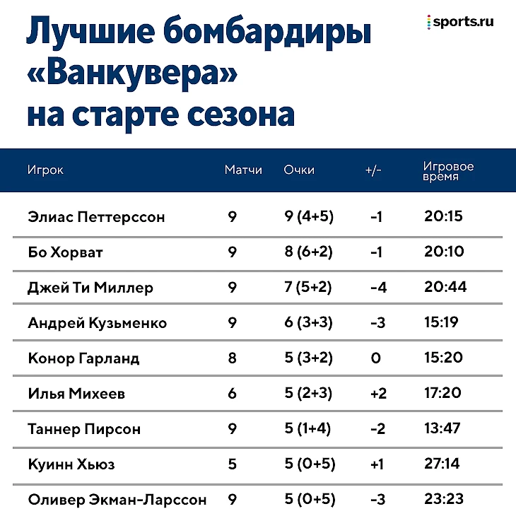 На выходе у Кузьменко и Михеева по 2+2 в двух последних играх. Андрей прямо сейчас лучше по результативности после троицы лидеров «Ванкувера» – Петтерссона, Хорвата и Миллера. У него 3+3 в 9 матчах, но средний айстайм ниже на целых пять минут! Илья тоже неподалеку: в его активе 2+3 после 6 матчей.