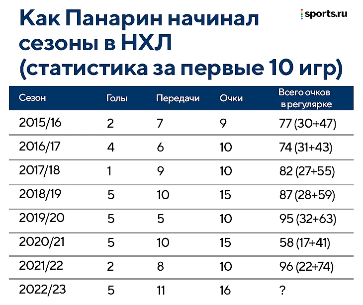 А Панарин тем временем в шикарном темпе набирает очки. Прямо сейчас он третий бомбардир лиги и безоговорочно лучший среди наших игроков. У него уже 16 (5+11) очков в 10 матчах, и в этой регулярке он не набирал очки только во встречах против «Айлендерс» (тогда «Рейнджерс» вообще ушли со льда с нулем) и с «Коламбусом» (а им забили всего одну).