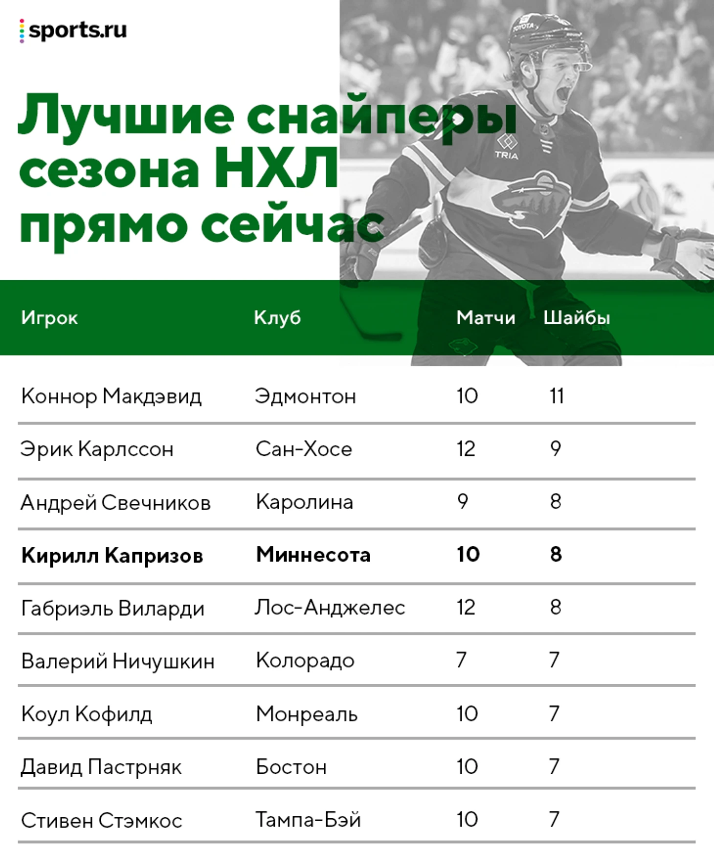 Но самое интересное, что Кирилл теперь делит третью строчку в списке лучших снайперов лиги. В прошлом году он остановился на отметке в 47 шайб – и теперь многие ждут от него полтинника. И если конкурировать с Макдэвидом будет действительно сложно, то выбить 50 голов за регулярку Капризову в таком темпе вполне по силам.