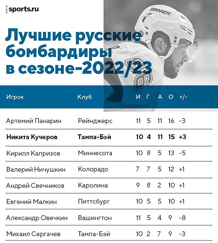 Пока Никита просто выжигает – на его счету 15 (4+11) очков в 10 матчах. Он идет на шестой строчке в списке бомбардиров, а среди русских в этом сезоне уступает только Артемию Панарину, у которого на один гол больше. Пока всего шесть наших игроков набирают в среднем больше очка за игру – Кучеров один из них.