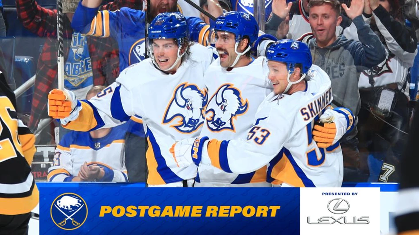 "Буффало Сэйбрз"-"Питтсбург Пингвинз" 6:3.Виктор Олофссон забросил 2 шайбы,Тэйдж Томпсон набрал 2 очка (1+1),Джефф Скиннер с Расмусом Далином и Оуэном Пауэром отдали по 2 результативные передачи,Эрик Комри отразил 18 бросков.У гостей Евгений Малкин отдал 2 результативные передачи."Клинки" выиграли 3 игру подряд.