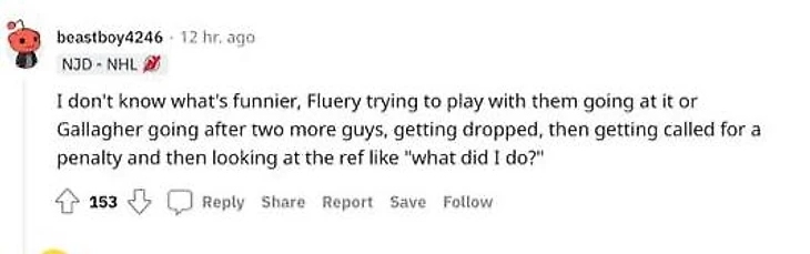 «Я не знаю, что смешнее – Флери, пытающийся продолжать игру, или Галлахер, который следом атаковал еще двоих, затем потребовал штраф и потом смотрит на судью и такой: «А что я сделал?»