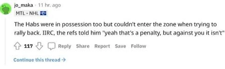 «Хабс владели шайбой, но не смогли войти в зону. Кажется, судья сказал ему: «Вообще это штраф, но если нарушили на тебе, то нет»