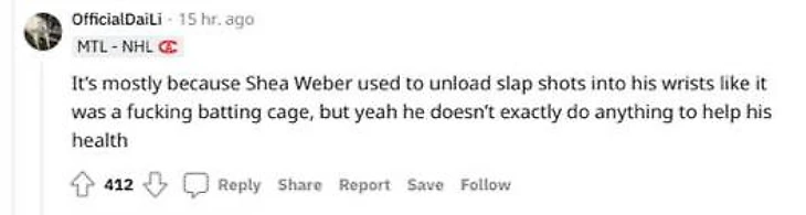 «Это из-за того, что Ши Уэбер бил по запястьям, как будто это была чертова клетка бейсболистов. Но да, он не делает ничего, чтобы помочь своему здоровью»