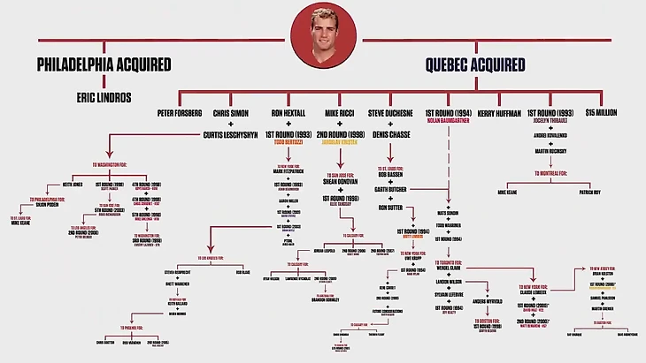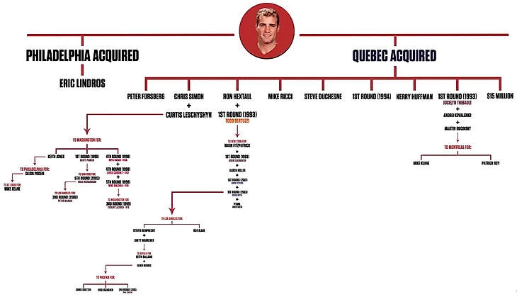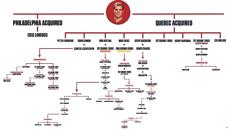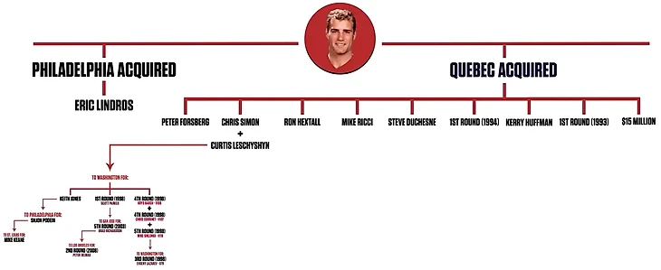 А теперь вопрос: что делать, если первый номер драфта просто отказывается играть за вашу команду? Ответ очевиден – обменять его! И если бы сейчас обмен Линдроса уже считался бы блокбастером, обменяй его на двух крепких игроков, то в 90-ые все было далеко не так. В сделку с «Квебеком» вступила «Филадельфия», которая отдала за Эрика Линдроса целых 9 опций: Петера Форсберга – на секундочку, 6 номера драфта того же года, Криса Саймона, Рона Хекстолла, Майка Риччи, Стива Дюшесны, Керри Хаффмана, пики в 1 раундах драфтов 1993 и 1994 года и 15 миллионов долларов сверху! Ещё разок – «Филадельфия» отдала за Линдроса 6 игроков, два пика в 1 раундах и ещё 15 миллионов баксов! Главная цель таких разборов – посмотреть, как обмен повлиял на обе стороны сделки. И, разумеется, сторона «Квебека» здесь куда шире и интереснее, но для начала предлагаем вспомнить невероятную карьеру Эрика Линдроса.