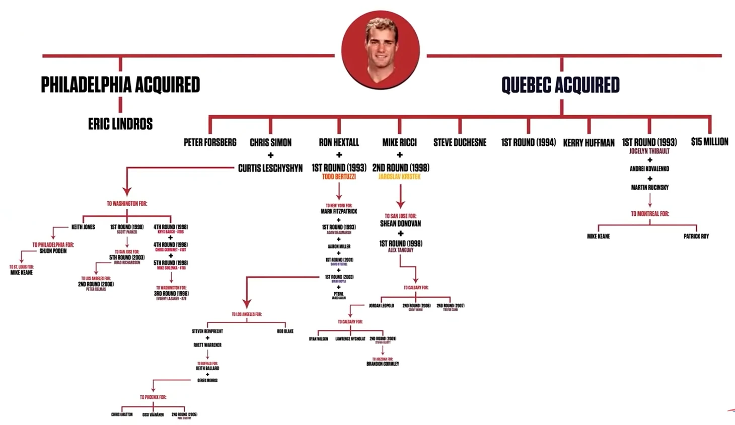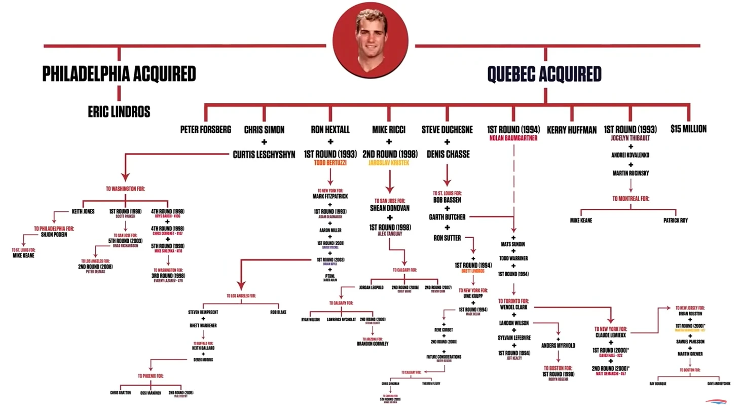 Друзья, всем привет, рад приветствовать вас в своем блоге SportTalk. Меня зовут Филипп Майков, я создатель, автор и голос одноименного YouTube-канала о хоккее и Национальной Хоккейной Лиге. И вот спустя 4 года мы созрели для самого большого материала на нашем канале, почти что документального фильма. Если вы следите за нашим блогом, то наверняка знаете про серию наших материалов под названием "История одного обмена", где мы разбираем самые интересные сделки в истории НХЛ. Сегодня мы готовы представить вам материал, который мы делали несколько месяцев. Сразу скажем, что оригинальная история принадлежит не нам, здесь огромное спасибо человеку по имени Стив Глинн или же Стив Дэнгл, я думаю, многие из вас его знают. Это переводной материал, однако это далеко не копирка. Мы доработали оригинальную историю, добавили детали, поменяли структуру и готовы представить вам свой собственный фильм. Поверьте, мы потратили на создание этого текста и видео очень много сил и времени, а потому хотелось бы, чтобы эту историю увидело как можно больше поклонников НХЛ. Конечно, было бы здорово попасть на главную Спортса, но и ваши плюсы под этим материалом нас очень обрадуют. Эта история о том, как одна сделка перевернула мир НХЛ в конце 90-ых и начале 2000-ых. Как одна сделка породила команду-династию. Эта история об одном из самых громких и запутанных обменов в истории хоккея – переходе легендарного Эрика Линдроса из «Квебека» в «Филадельфию».