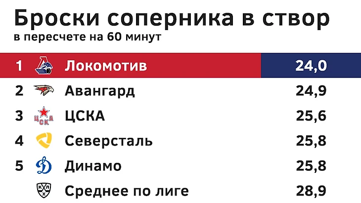 Это работало раньше, работает и сейчас – соперники вязнут на входе в зону, полевые блокируют в среднем по 3 броска из 10, выпущенных в сторону ворот. Элитный показатель для КХЛ, лучший результат по блокам был только у «Авангарда» при Хартли. На голкиперов «Локо» приходится наименьшая нагрузка во всей лиге.