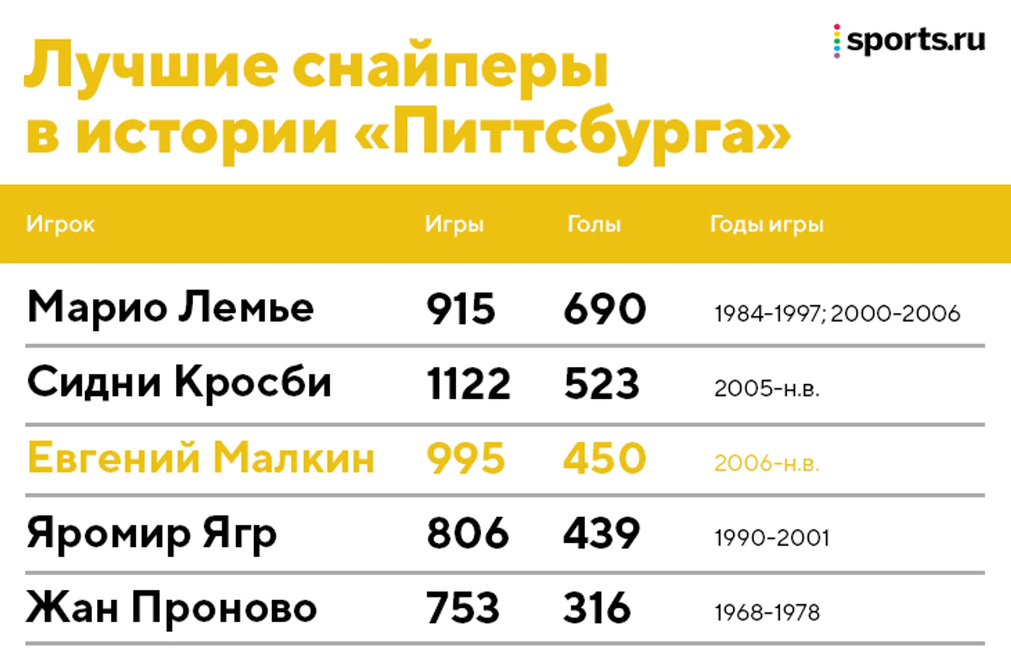 Малкин по-прежнему третий в списке снайперов в истории франшизы – до рекорда Марио Лемье слишком далеко, а если кто и доберется до первого места, то это будет Сидни Кросби.