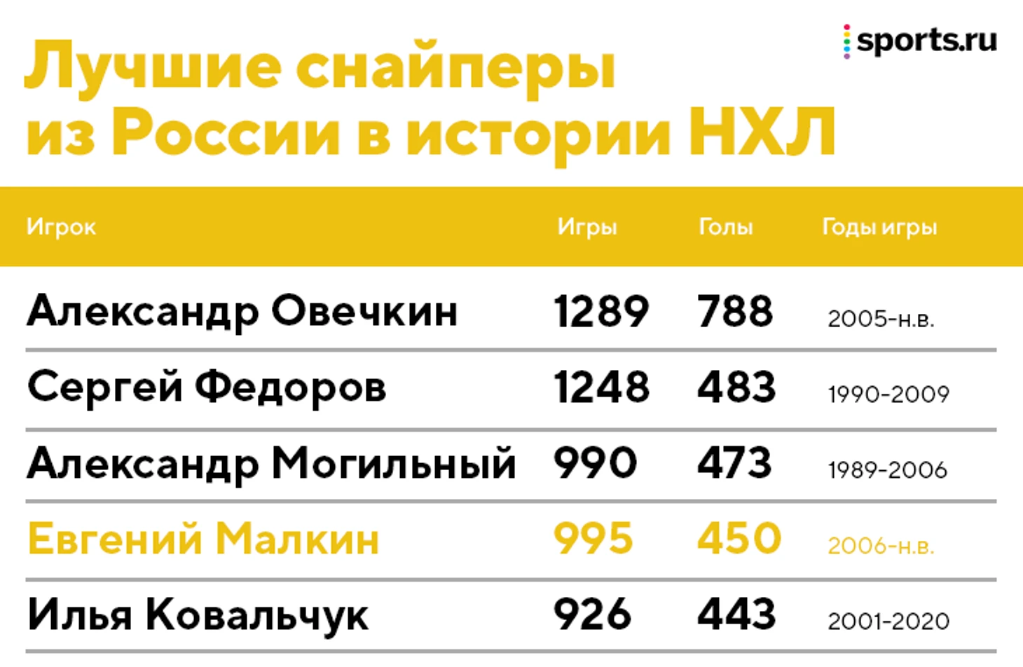 Также далеко и до российского рекорда Александра Овечкина – он мотивирован обойти Уэйна Гретцки и имеет фору в 300+ шайб. А вот на вторую строчку до конца карьеры Малкину вполне по силам забраться. Уже совсем скоро он отметит большой юбилей – через пять матчей у него 1000-я игра в НХЛ.