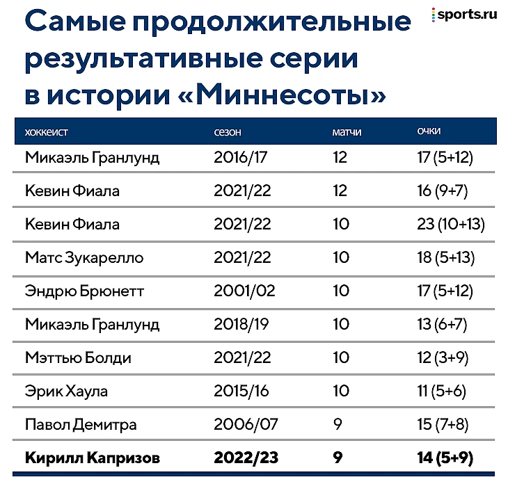 Девять игр подряд с набранными очками – личный рекорд Капризова. Причем серия началась с дубля в ворота «Анахайма», который случился сразу после той самой стычки с Даути. Тогда НХЛ в какой-то степени простила форварду его срыв, он зарешал в следующем же матче и не останавливается до сих пор. В итоге он стал первым хоккеистом в истории «Уайлд», у которого были три серии с восемью и более результативными играми: два предыдущих 8-матчевых отрезка он выдал в прошлом сезоне.
