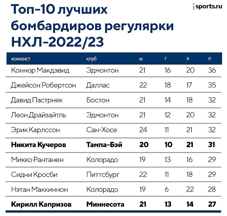 На отрезке из девяти матчей Капризов выбил 14 (5+9) очков и ворвался в топ-10 лучших бомбардиров регулярки – сейчас у него в общей сложности 27 (13+14) баллов. Коннор Макдэвид со своими 36 очками оторвался далековато, но среди русских Кирилл – первый снайпер (13 голов еще и у Андрея Свечникова) и второй по очкам после Никиты Кучерова.