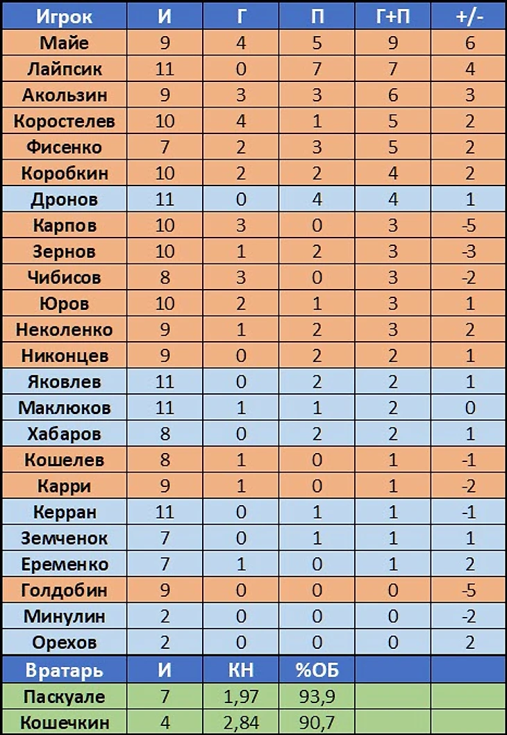 Среди нападающих наибольший вклад в результативность команды продолжают делать легионеры Майе и Лайпсик. Неожиданно второй по эффективности тройкой стала номинально четвёртая Коробкин-Фисенко-Акользин – Илья Воробьёв, наверняка сам того не ожидая, попал с этим звеном в точку. А вот у Никонцева, Кошелева, Карри и Голдобина игра в этом месяце не задалась. Николай и вовсе стал худшим по всем показателям.