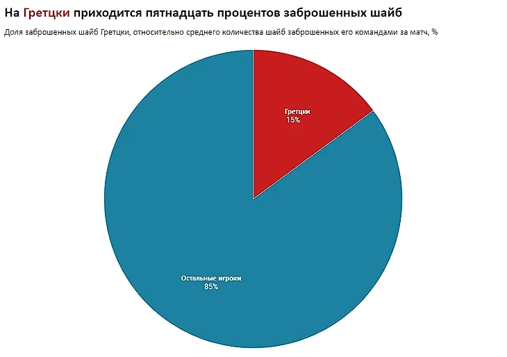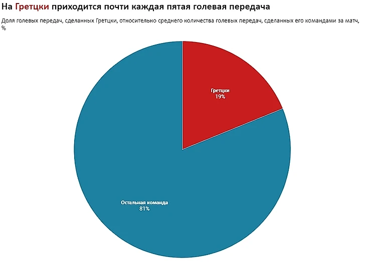 Из диаграмм следует, что на Гретцки приходилась почти каждая пятая голевая передача, сделанная игроками его команд. По этому показателю он не теряет первенство даже с учетом времени, в которое он играл. Единственный кто смог ближе всех подобраться по этому показателю - Марио Лемье.