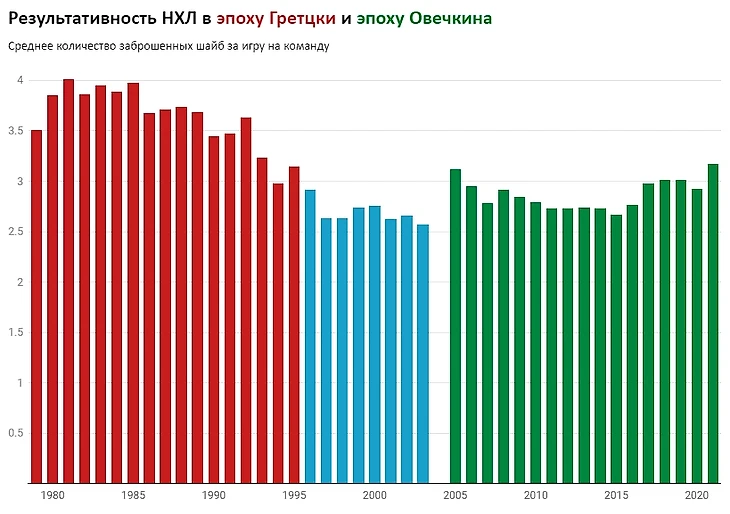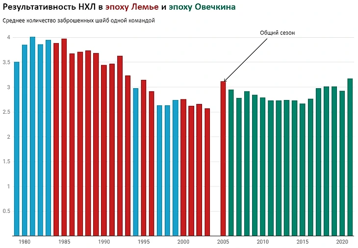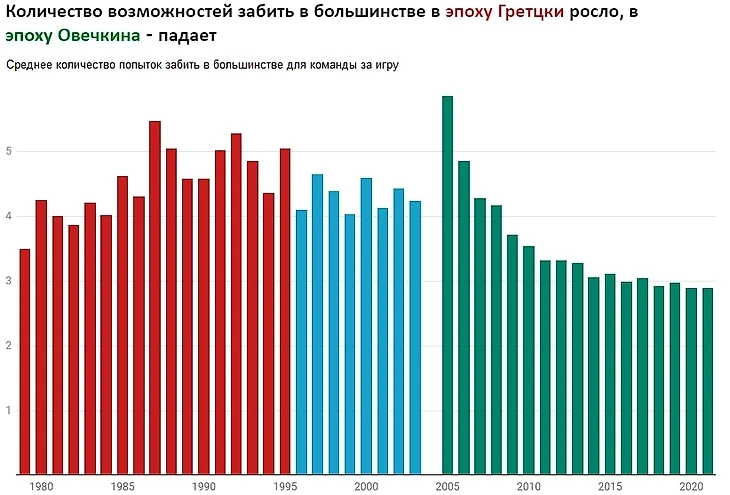 Овечкин же пришел в лигу сразу после локаута, во время которого изменили некоторые правила: ужесточили правила по зацепам и задержкам, уменьшили размер средней зоны, уменьшили амуницию вратарей, ввели потолок зарплат, изменили схемы игр между клубами, все это положительно сказалось на результативности. Однако по ходу карьеры результативность лиги падала - лучшие годы Ови пришлись как раз на ее падение. Тем не менее, сейчас результативность опять растет, что также помогает Ови догонять Гретцки в абсолютных значениях.