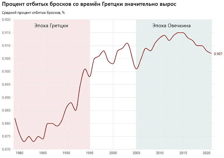 Вот, например, график процента отбитых бросков. Из него видно, что вратари с тех времен стали лучше, в том числе и за счет амуниции.