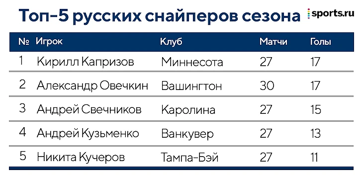 Что касается текущего сезона, то Овечкин пытается ворваться в десятку лучших снайперов. У него 17 голов после 30 игр (0,57 в среднем за матч) – столько же еще у трех игроков, которые в нижней части топ-10. В их числе и Кирилл Капризов, так что, именно они с Овечкиным возглавляют список русских снайперов регулярки.