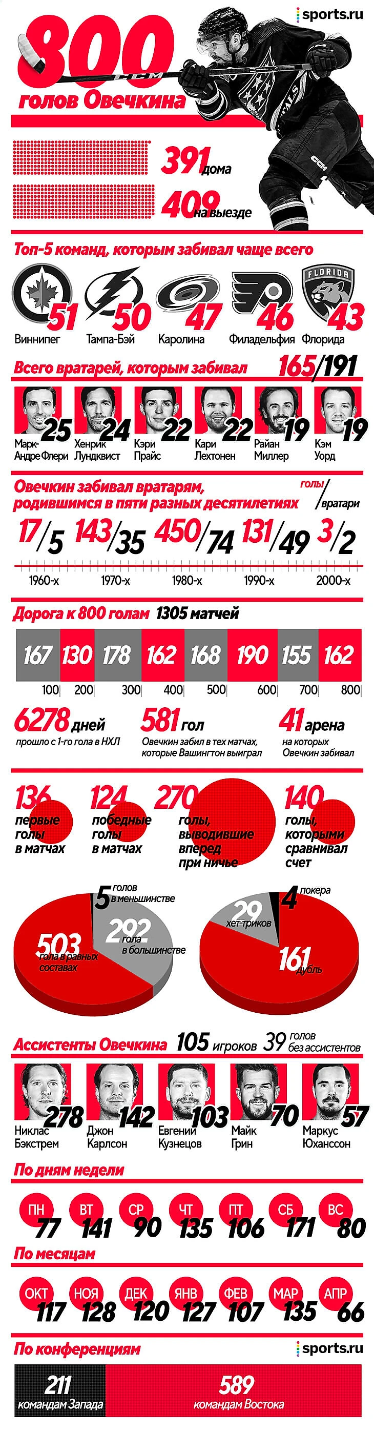 Все о 800 голах Овечкина в НХЛ. Подсчитали даже дни недели, в которые он чаще забивал